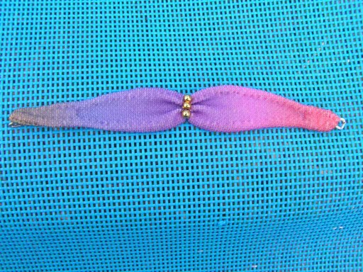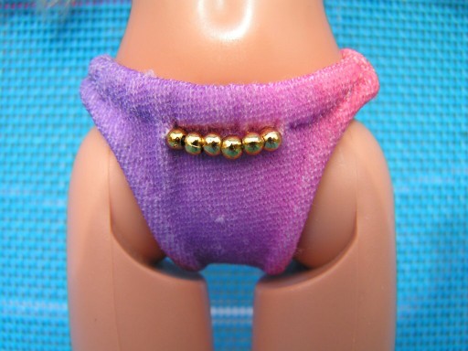 Oboje plavky jsem ušila z mých starých duhových plavek. Jsou dozdobeny zlatými korálky, které jsem původně chtěla dát i na gumičku kolem krku, ale pak mi to přišlo přeplácané. Na zapínání vrchního dílu jsem použila očko ze staré podprsenky a na háček ohnutou a zkrácenou kancelářskou sponku.